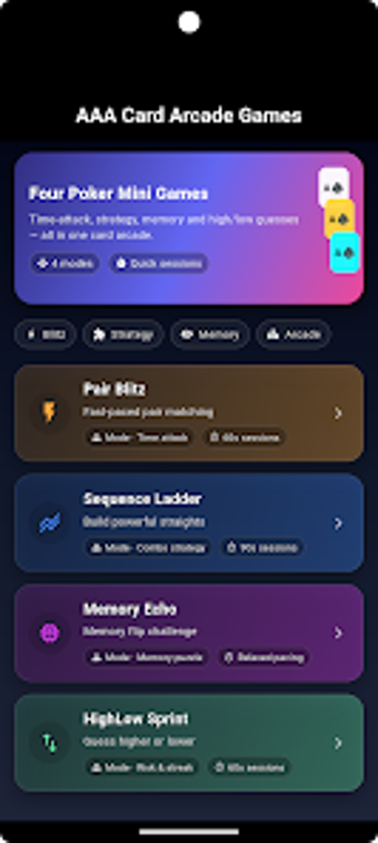 AAA Card Arcade Games is an exciting collection of four poker-inspired mini games designed for Android users. This free-to-download application offers a variety of engaging gameplay experiences that include fast pair-matching, building powerful straights, memory challenges, and high/low guessing games. Each game is crafted to provide quick, replayable sessions that are easy to learn yet challenging enough to keep players coming back for more.